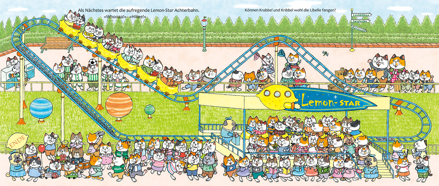 Such dir deine Lieblingskatze aus – und entdecke auf jeder Seite, was sie gerade macht. Versteckt sie sich? Probiert sie die Achterbahn aus? Oder nascht sie etwa vom Erdbeereis?